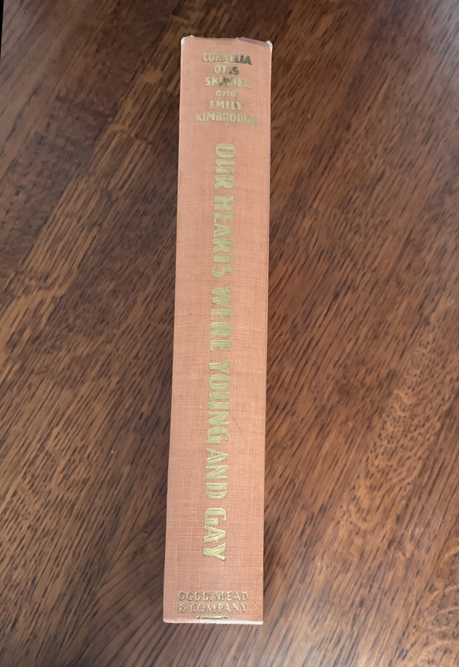 OUR HEARTS WERE YOUNG AND GAY by CORNELIA OTIS SKINNER and EMILY KIMBROUGH. CHAPTER 1: WE had been planning the trip for over a year. Pinching, scraping and going without sodas, we had salvaged from our allowances and the small time jobs we each had found the preceding vacation the sum of 80.00, which was the cost of a minimum passage on a Canadian Pacific liner of the cabin class. Our respec tive families had augmented our finances by letters of credit generous enough to permit us to live for three months abroad if not in the lap of luxury, at least on the knees of comfort. For months we had been exchanging letters brimming over with rapturous plans and lyric an ticipation and now June had really rolled around and the happy expectancy of the brides-to-be of that year had noth ing on us. It was settled we could meet in Montreal at whatever hotel it is that isnt the Ritz. I, clutching and occasionally kissing our steamship passage, was arriving from New York, Emily from Buffalo. That is, I hoped Emily was arriving. Emilys notions concerning geography, like some of her other notions, were enthusiastic but lacking in ac curacy. Some weeks previous she had sent me a rhapsodic letter which ended with the alarming words, I live for the moment when our boat pushes out from that dock in Win nipeg. I had written back in a panic and block letters stating, somewhat crushingly I thought, that the CJP. O. seldom sent its ships overland, that we were sailing from Montreal, Province of Quebec, that the name of our ves sel was the Montcalm and the date June loth, the year of our Lord I shant say which, because Emily and I have now reached the time in life when not only do we lie about our ages, we forget what weve said they are. Emily wrote back not to worry, darling, she had it all straight now. Moreover she was being motored up from Buffalo by friends who had been abroad often and who wouldnt dream of driving her to the wrong place. They would arrive sometime the afternoon of the pth. No such traveled and plutocratic friends offered to motor me to Canada, so I purchased an upper on the Mon treal sleeper … a bit of misguided economy because once aboard the train I had to pay for another upper in order to accommodate my collection of luggage. The Skinners have ever, I believe, been respectable, God-fear ing folk, but in those days my family made up for the lack of a skeleton in the closet by having extremely dis reputable-looking luggage. Mother, the most exquisite of women, was fastidious to a degree when it came to the care of her clothes and mine, but she didnt care what she packed them in as long as the receptacle was clean. Conse quently on this, the occasion of my first long trip on my own, she had, with loving care and acres of tissue-paper, stowed my effects in an assortment of containers that ranged from a canvas trunk Father had used when he played at Dalys, to a patent leather thing for hats that looked like a cover for a bass drum. There was a strap bound straw affair known for some reason as a telescope, and various other oddments. I was made to carry my good coat the one in which I traveled was my every day on a stout hanger in a voluminous green dress-bag which had a hole at the top and through that emerged the hook for hanging It up. It was a formidable looking contrivance and I used to glance nervously at that hook, half anticipat ing the sight of a human eye impaled upon it…